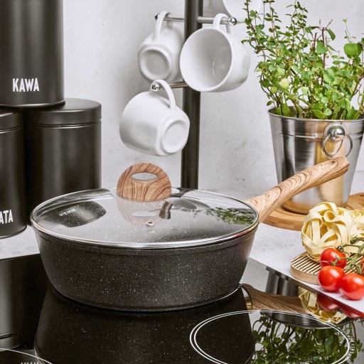 Dno indukcyjne (można stosować na każdym rodzaju kuchenki). Lekka i wytrzymała konstrukcja z odlewu aluminiowego. Patelnia marmurowa Pescado szybko się nagrzewa i równomiernie wykorzystuje zgromadzone ciepło. Trójwarstwowa, wyjątkowo twarda powłoka typu stone, która dzięki chropowatej powierzchni jest jeszcze bardziej odporna na zadrapania, ścieranie i wysokie temperatury. Zastosowany efekt kamiennego proszku — Ball Blasting sprawia, że powierzchnia jest dodatkowo wzmocniona, co zwiększa komfort użytkowania. Głęboki profil pozwalający na komfortowe mieszanie dużej ilości składników oraz przygotowanie większej ilości elementów potrawy. Produkt bezproblemowy w czyszczeniu oraz pielęgnacji. Gustowne wzornictwo patelni granitowej, na które składa się m.in. rączka stylizowana na drewnianą. Uchwyt nie nagrzewa się i zapobiega przypadkowemu wyślizgnięciu się patelni z dłoni podczas przenoszenia. Produkt ma rekomendację Ewy Wachowicz. Jako ambasadorka marki Konighoffer, gorąco i z uśmiechem poleca go ona do domowego użytku. Razem z nim zdobędziesz twój przepis na dom. To jedna z najlepszych opcji w tej kategorii!
