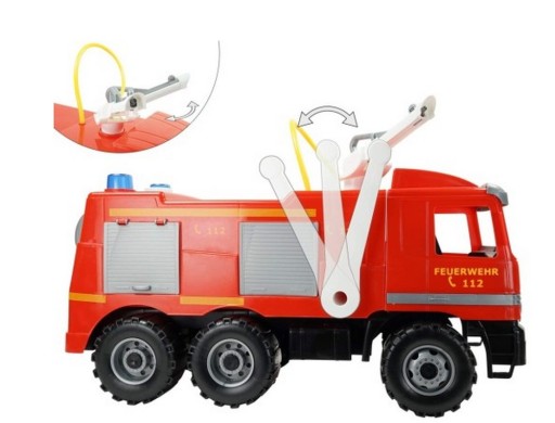 Dlatego dziecko może korzystać z pojazdu, jako jeździka. Ponadto armatka psikająca wodą i ruchome elementy zapewnią maluchowi wiele frajdy i ruchowej zabawy. Wóz strażacki posiada półtoralitrowy zbiorniczek, do którego wlejecie wodę. Teraz maluszek może skierować sikawkę, która obraca się o 360°, w miejsce, które chce ugasić i zacząć psikać wodą, pompując ją za pomocą wygodnej dźwigni na boku pojazdu. Armatkę wodną można również odmontować z dachu wozu i wziąć ją w rączkę.
