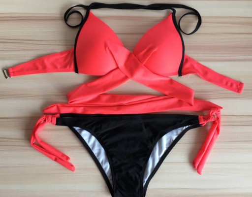Kobiecy i niezwykle seksowny komplet kąpielowy składający się z biustonosza oraz fig. Oryginalny model biustonosza z wiązaniem pozwoli wyróżnić się na plaży!