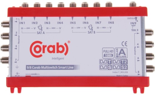 Multiswitch Corab 9/8 Smart Line z 8 wejściami satelitarnymi dla dwóch konwerterów Quattro i 1 wejściem z anteny telewizji naziemnej (dvb-t) umożliwia dystrybucję sygnału do 8 gniazd abonenckich TV SAT (gniazda są dostępne w naszej ofercie).