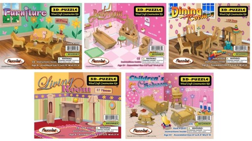 Mebelki wykonane są ze sklejki drewnianej. Powycinane elementy wyciskamy z szablonu ,dopasowujemy i łączymy z sobą na wcisk według załączonej instrukcji .Bez użycia żadnych dodatkowych narzędzi powstanie przestrzenny przedmiot.