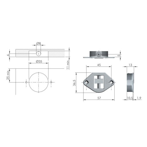 Za pomocą tej zawieszki wieszamy półki, małe szafki, lustra w ramkach drewnianych itp.. W tylnej części półki wiercimy otwór o średnicy 35mm. W wywiercony otwór wbijamy zawieszkę przykręcamy ją i zawieszamy półkę. W górnej części zawieszki jest otwór przez który mamy dostęp do śruby regulacyjnej. Zakres regulacji ok 11mm