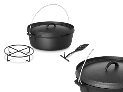 Żeliwny garnek marki Royal Catering umożliwi przygotowanie zup, risotto, gulaszu, oraz rożnego rodzaju potraw jednogarnkowych zarówno w warunkach domowych, jak i w plenerze. Sprawdzi się także do pieczenie chleba, przyrządzania puddingu i zapiekanek.