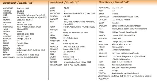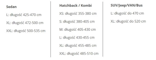 PONIŻEJ TABELA Z ROZMIARAMI - JEŻELI MACIE PAŃSTWO PROBLEM Z DOBRANIEM ODPOWIEDNIEGO ROZMIARU LUB JEŻELI W SPISIE NIE MA PAŃSTWA AUTA, TO PO ZAKUPIE PROSZĘ O WIADOMOŚĆ Z MODELEM, ROCZNIKIEM I RODZAJEM NADWOZIA, A MY DOBIERZEMY ODPOWIEDNI ROZMIAR