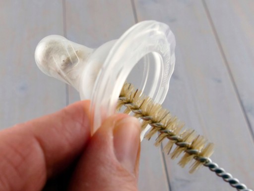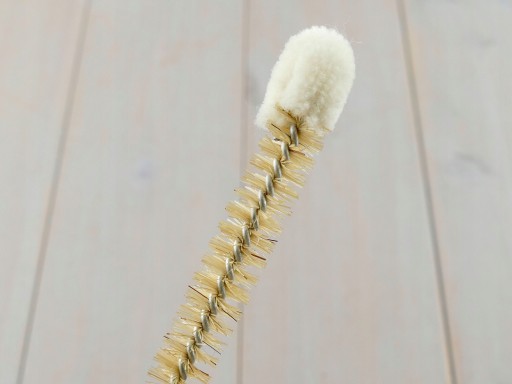 Mała szczoteczka - idealna do mycia wąskich otworów, małych elementów, butelek, smoczków, probówek. Końcówka zakończona naturalną bawełną gwarantuje dokładne umycie smoczków.