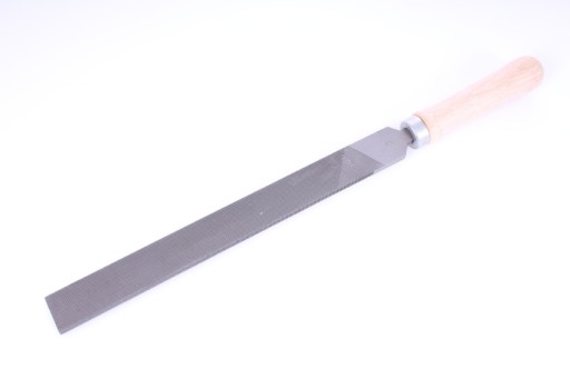 Pilnik półgładzik stosowany do wygładzania powierzchni metalowych, zakończony jest drewnianą wyprofilowaną rączką.
