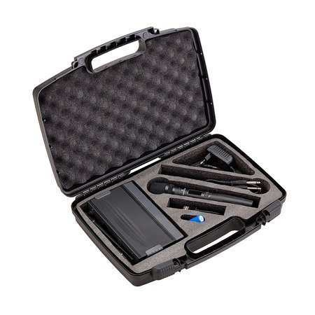 Cechy kluczowe: Pasmo pracy UHF E (823-832 MHz) Technologia cyfrowego przesyłania audio Monitorowanie stanu mikrofonu na odbiorniku Brak zakłóceń nawet na tej samej częstotliwości Bardzo niskie opóźnienia audio Częstotliwość próbkowania 48kHz Pasmo przenoszenia 30-20kHz Kolorowy wyświetlacz TFT w odbiorniku Automatyczne skanowanie częstotliwości i analizator widma Idealny dystans pracy 50m System synchronizacji Tx-Rx (IR) dla szybkiego rozpoczęcia pracy Profesjonalny mikrofon z dynamiczną, kardioidalną kapsułą i akumulatorem Zestaw Rack dla 1 lub 2 jednostek odbiornika do jednostki rack 19” (opcjonalne) System: Częstotliwość: UHF823-832MHz Przepustowość: 9MHz Przepustowość kanału: 100kHz Presety: 10 grup, 9 częstotliwości w każdej Zakres dynamiki: >98dB Współczynnik zawartości harmonicznych (THD): <0,1% Pasmo przenoszenia: 30Hz-20kHz / ±2dB Poziom audio na wyjściu: Symetryczne 400mV; niesymetryczne 400mV Wymiary transportowe: 436 x 104 x 324mm Waga transportowa: 2,5kg Odbiornik: Zasilacz: DC 12V / 1000mA Pobór mocy odbiornika: 5W Stosunek S/N: >98dB Czułość odbioru: -95dBm Opóźnienie: <3ms Wymiary: 210 x 45 x 118mm (bez anten) Długość anten: 255mm Waga: 0,4kg Mikrofon: Moc: 10mW Typ modulacji: DQPSK Bateria: 1x 3,7V - 1200mAh Litowa bateria z możliwością ponownego ładowania (typ 18500) Czas pracy: 5-7 godzin Czas ładowania baterii: około 3,5 godziny Wymiary: Ø35 (min) - Ø46 (max) x 240 mm Waga: 0,26kg (z bateriami)
