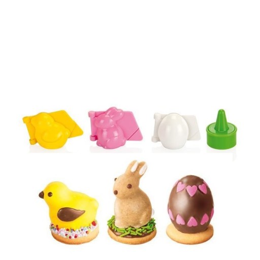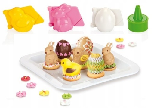 Komplet zawiera 3 otwierane foremki z motywami wielkanocnymi oraz foremkę do robienia otworu z wykrawaczem.