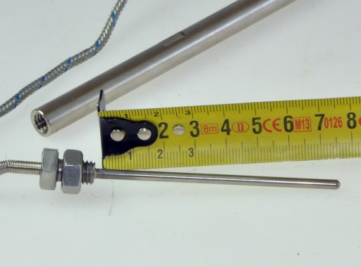 Używany, całkowicie sprawny czujnik temperatury - termopara w stalowej osłonie. Czujniki były wykorzystywane do stabilizacji temperatury promienników podczerwieni nagrzewających elementy w piecu.