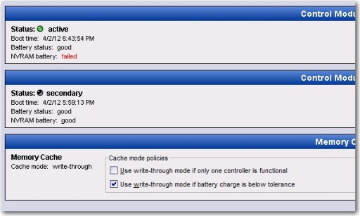 Usterka powoduje wyłączenie pamięci cache na macierzy, co powoduje drastyczny spadek wydajności I/O.
