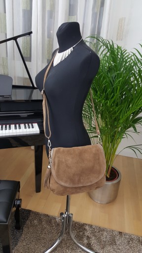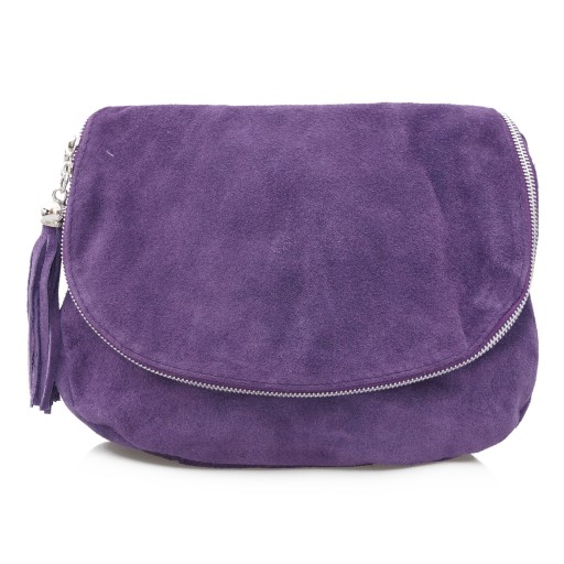 Torebka damska listonoszka znanej i cenionej włoskiej marki VERA PELLE ITALY w kolorze FIOLETOWYM. Wykonana została bardzo starannie, z dbałością o najmniejsze szczegóły z pachnącej i mięciutkiej w dotyku zamszowej skóry naturalnej. Do torebki dołączony jest długi regulowany i odpinany pasek o długości maksymalnej 120 cm, dzięki czemu możesz ją idealnie dopasować do swojego wzrostu i preferencji. Z przodu torebka zamykana jest na magnesik a w środku na solidny suwak. Środek torebki jest jednokomorowy oraz wykończony podszewką. W środku znajdziesz dodatkową praktyczną kieszonkę zamykaną na suwak. Przednia klapa zamykana jest również na suwak i może służyć jako funkcjonalna kieszeń oraz dodatkowo ozdobiona jest breloczkiem - frędzelkiem. Torebka idealnie sprawdzi się w codziennym użytkowaniu a dzięki wysokiej jakości wykonania posłuży długi okres czasu. Klasyczny wygląd sprawia, że bezie pasowała do niemal każdej codziennej stylizacji.