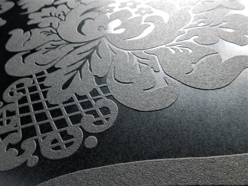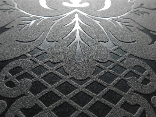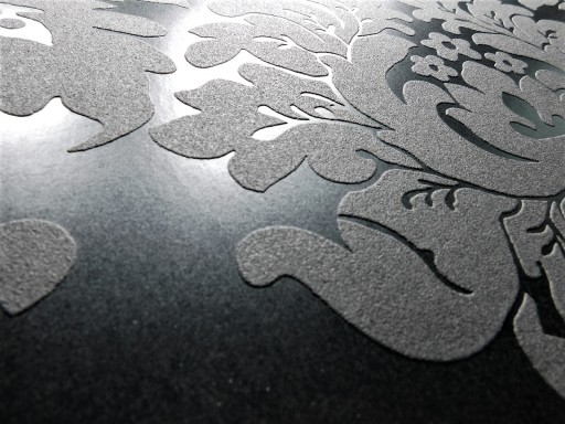 Wyraźnie zaznaczona faktura tapety, ornament wypukły o strukturze weluru, tło z satynowym połyskiem.