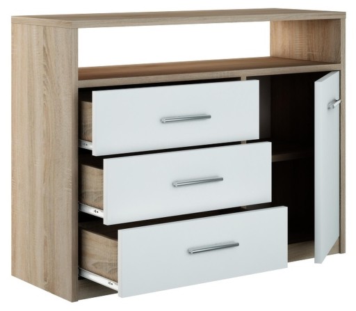 Komoda składa się z części z szufladami z lewej strony, szafki z półką z prawej strony i otwartej półki nad szufladami i szafką.