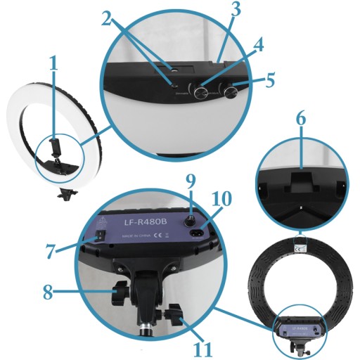 W wewnętrznej części pierścienia istnieje możliwość zamontowania głowicy kulowej wraz z uchwytem na telefon oraz znajduje się uchwyt do zawieszenia lampy na jej tylnej części.