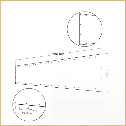 Stabilne - Dzięki optymalnemu rozmieszczeniu metalowych oczek co 50cm lub 25cm za dodatkową opłatą (należy kupić osłonę w zestawie z usługą montażu dodatkowych oczek) na górze, dole oraz 4 oczek na brzegach materiału, osłony stabilnie przylegają do powierzchni balkonu, balustrady czy ogrodzenia.