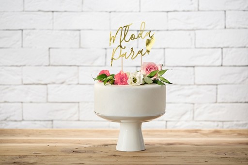Topper na tort Młoda Para, wykonany z papieru lustrzanego w kolorze złotym, wysokość ok. 22,5 cm.