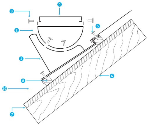 Kompletna ława kominiarska składa się ze wspornika do blachodachówki (1), kołyski ławy kominiarskiej (2) oraz platformy ławy kominiarskiej (4), natomiast kompletny stopień kominiarski składa się ze wspornika do blachodachówki (1) i stopnia kominiarskiego.