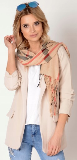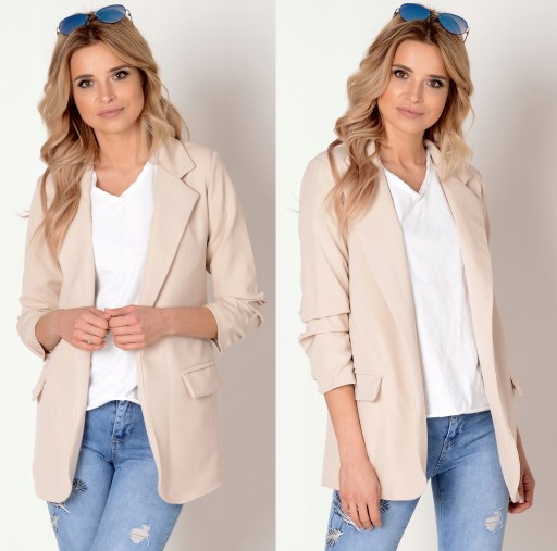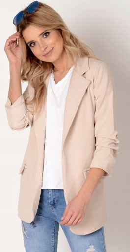 Model dłuższy, smokingowy pasujący do eleganckiego jaki i casualowego stylu. Doskonałe dopełnienie stylizacji do pracy, na uczelnie lub na wieczorne wyjście. Oryginalnego charakteru dodają drapowane rękawy o długości 3/4. Dwie kieszonki po bokach z efektownymi klapami upiększają marynarkę. Fason luźny, z podszewką i miękkimi poduszkami w ramionach.