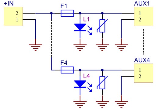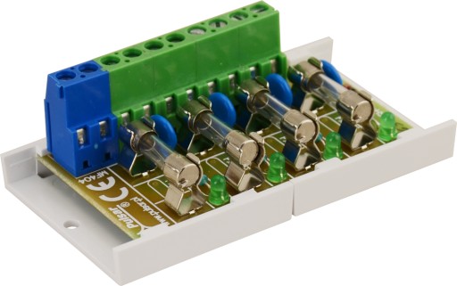 Moduł bezpiecznikowy LB4/4x2A/2,5/FTA przeznaczony jest do rozdziału zasilania w systemach niskonapięciowych wymagających napięcia z zakresu 10V÷30V DC Posiada wejście IN do podłączenia zasilania oraz cztery niezależnie zabezpieczone bezpiecznikami topikowymi 2A wyjścia zasilania AUX1÷AUX4. Zadziałanie bezpiecznika sygnalizowane jest poprzez zgaszenie odpowiedniej diody LED modułu: L1 dla AUX1, L2 dla AUX2 itd. Dodatkowo każde z wyjść zabezpieczone jest warystorem chroniącym zasilacz oraz odbiorniki przed skutkami wystąpienia przepięć w układzie zasilania. Moduł jest przystosowany do podłączenia przewodów o maksymalnym przekroju 2,5mm2.