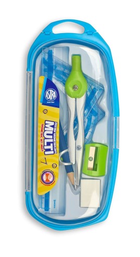 Zestaw przyrządów geometrycznych firmy Astra w plastikowym pudełku. W skład zestawu wchodzi 8 elementów: