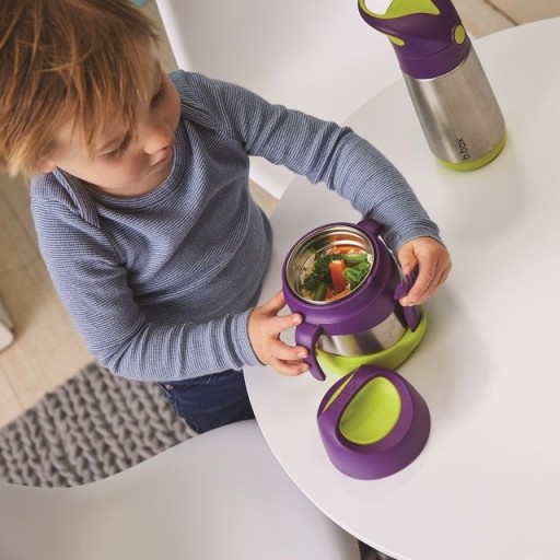 Niezwykle praktyczny i estetycznie wykonany dziecięcy termos na jedzenie firmy B.Box. Wykonany z wysokiej jakości stali nierdzewnej. Stal nie wchodzi w reakcję z produktami spożywczymi. Podwójne ścianki doskonale utrzymują temperaturę. Według testów firmy B.Box termos potrafi utrzymać temperaturę ciepłego posiłku do około 5 godzin, zimnego do około 7 godzin*. Termos jest bardzo funkcjonalny i prosty w użyciu przez dzieci. Razem z termosem w zestawie jest plastikowy łyżeczko-widelec.