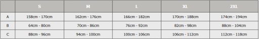 A - wzrost | B - obwód pasa | C - obwód bioder
