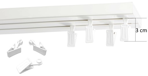- 2 torowa szyna w kolorze białym o długości 320 cm (2x 160cm). Karnisze o długości do 250 cm dostarczamy w całości, a powyżej 250 cm w dwóch równych częściach