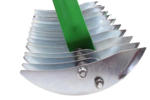 Polskiej produkcji grabie metalowe do napowietrzania trawy. Pokryte są lakierem. Zęby są z stali nierdzewnej