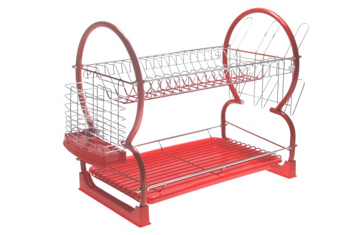 Dwupoziomowa suszarka wykonana z pochromowanej stali posiada ociekacz na sztućce i uchwyty na kubki.