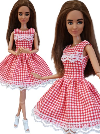 Przedmiotem sprzedaży jest śliczna sukienka. Uszyta z dzianiny w biało - czerwoną krateczkę. Ozdobiona koronką. Zapięcie na delikatny rzep.