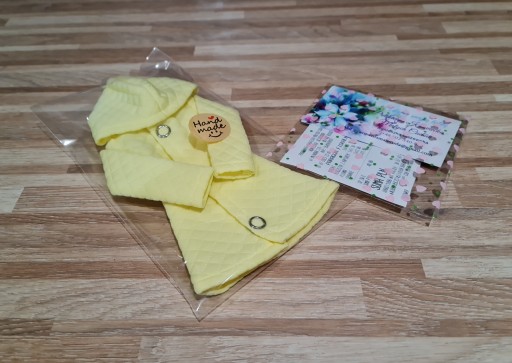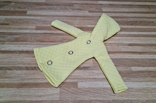 Przedmiotem sprzedaży jest ubranko dla lalki modowej, modelki. Płaszczyk z kapturem uszyty z grubszej pikowanej dzianiny. Płaszczyk powstał w kilku kolorach, na tej aukcji kolor żółty. Zapięcie na profesjonalne springi.