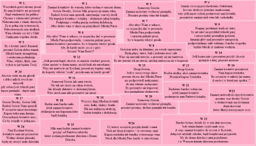 - lista gości w odmienionej formie jedno pod drugim lub informacja o pozostawieniu wykropkowanego miejsca na własnoręczny wpis.