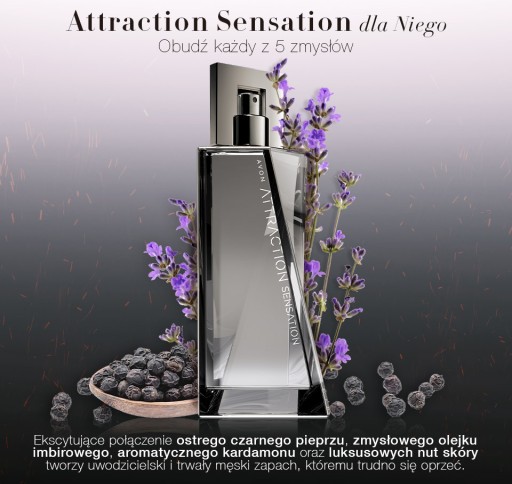 Męska woda toaletowa Avon Attraction Sensation obudzi wszystkie Wasze zmysły i znakomicie sprawdzi się na wieczorne spotkanie we dwoje.