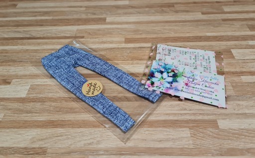 Przedmiotem sprzedaży są spodnie rurki dla lalek z plastikowymi nogami na gumce. Uszyte z dzianiny imitującej niebieski jeans o ciekawym widocznym splocie. Ozdobione srebrnym koralikiem.