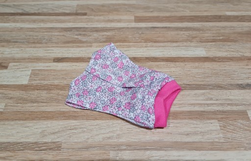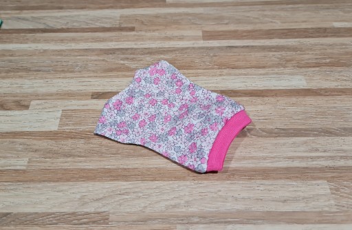 Przedmiotem sprzedaży jest bluzka. Uszyta z dzianiny w szare oraz różowe kwiatuszki. Dół wykończony różowym ściągaczem. Zapięcie na delikatny rzep.