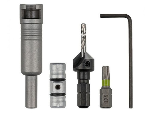 Dwustronny uchwyt szybko wymienny, pasujący do narzędzi o trzpieniu sześciokątnym 1/4“ pozwalający na zaoszczędzenie czasu podczas wykonywania prac dwuetapowychUchwyt do akcesoriów umożliwiający wymianę narzędzia w zaledwie kilka sekund przez odwrócenie uchwytu szybko wymiennegoMagnes dla szybkiego zamocowania końcówkiŚruba mocująca dla pewnego zamocowania nawiertakaZawiera nawiertak z pogłębiaczem i końcówkę 25 mm TORX do drewna i desek tarasowych a także klucz sześciokątny, SW 2