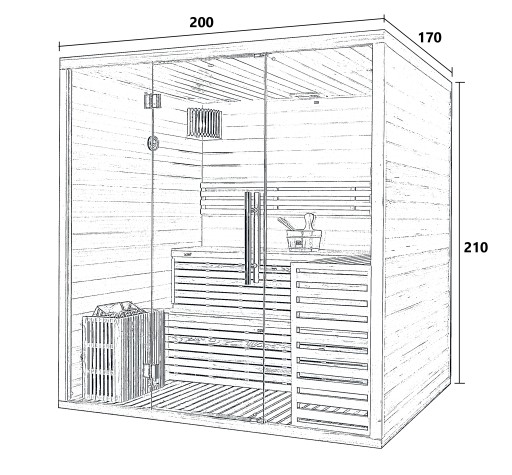 Umiejscowienie sauny powinno być tak dobrane, aby pozostawało co najmniej 20 cm między dachem a sufitem, ponieważ wylot wentylacji jest umieszczony na dachu.