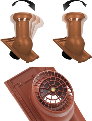 Wyposażenie kominków wentylacyjnych w okrągłą poziomicę, wbudowaną centralnie na środku daszka, pozwala doświadczonemu dekarzowi precyzyjnie ustawić kominek w pionie bez pomocy dodatkowych osób.
