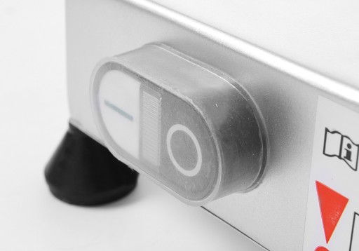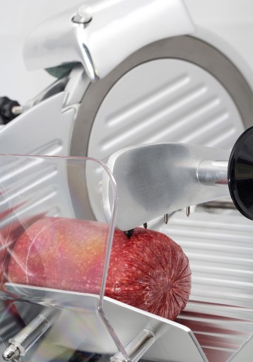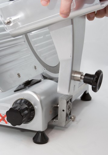 Krajalnica umożliwia bezstopniową regulację grubości krojenia w zakresie od 0 do 12 mm. Wózek posiada osłonę zabezpieczającą, pionową blokadę oraz dociskacz, który pozwoli na stabilne podtrzymanie produktów o średnicy do około 120 mm. Wózek można zdemontować tylko przy ostrzu ustawionym w pozycji 0.