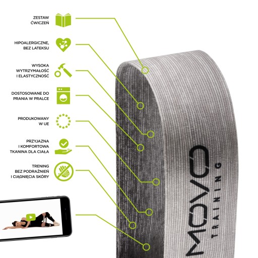MOVO ® Mini Band HARD wyróżnia materiał, z którego jest wykonana. Przyjazna i komfortowa dla ciała specjalna tkanina umożliwia wygodny trening, eliminując uczucie ciągnięcia i podrażnienia skóry. MOVO ® Mini Band HARD w kontakcie z nią jest przyjemnie miękka, a jednocześnie elastyczna i wytrzymała.