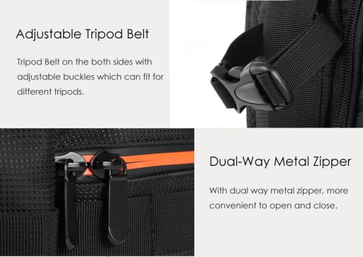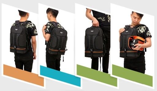 Plecak posiada dwa boczne zamki, które ułatwiają szybki dostęp do lustrzanki lub obiektywu. Plecak jest ponad to pojemny. Można do niego zapakować cały sprzęt, które jest ci potrzebny. Zmieści się body wraz z dużym obiektywem, laptop 15,6" (o wymiarach nie większych niż 39x25,5x3cm), lampa flash, dodatkowe obiektywy, duży statyw, kable, karty pamięci, zasilacze itd.