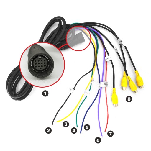 - W pokazanej na zdjęciu obok wiązce pod numerami 3-6 widać aktywatory poszczególnych sygnałów video (kanałów). Przewody te po otrzymaniu napięcia 12-24V automatycznie włączą na monitorze w pełnym rozmiarze dany kanał (1, 2, 3 lub 4).Jeżeli w tym samym czasie podamy napięcie na więcej niż jeden przewód - na monitorze automatycznie wyświetlą się wszystkie kanały odpowiadające aktywatorom.Dla przykładu: aktywator kanału 1 i kanału 2 dostają napięcie - na monitorze widzimy sygnał z kamery podłączonej do kanału 1 i kamery podłączonej do kanału 2.