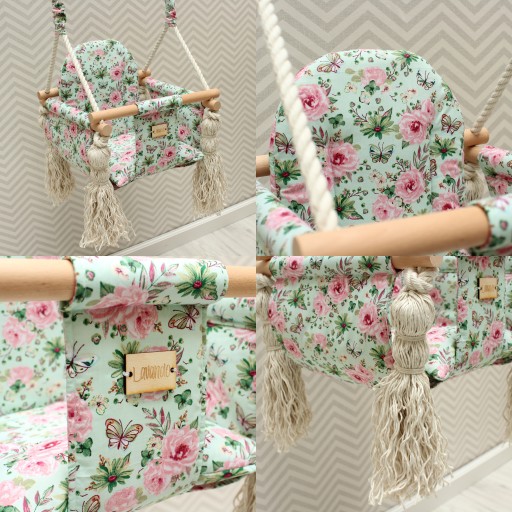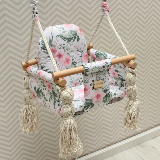 Huśtawka wykonana jest z tkaniny 100% bawełny, wewnątrz włóknina/ovata. Nasza huśtawka posiada usztywniane siedzisko i opracie. Z łatwością można je wyjąć do uprania. W zestawie otrzymują Państwo poduszkę/wkładkę. Huśtawka zawieszana jest na linach bawełnianych 3-żyłowych, skręcanych. Na każdym zakończeniu estetyczny chwost. Długość liny 2,5 m idealny do pomieszczeń o wysokości 2,6 m. Solidna lina gwarantuje bezpieczeństwo naszej pociechy. Poprzeczki wykonane z solidnego drewna bukowego. Poza oczywistymi walorami jakie idą za zabawą, huśtawka stanowić będzie piękny, ozdobny element każdego pokoiku. Każda huśtawka posiada dwie osłonki na liny.