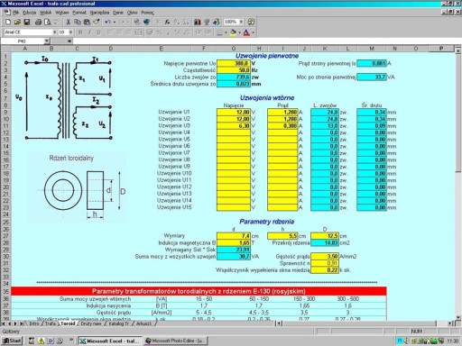 TRAFO-cad PROFesional jest aplikacją pracującą pod kontrolą arkusza kalkulacyjnego Excel 95 i wyższe. Umożliwia projektowanie dowolnych transformatorów (nie tylko sieciowych). Nie ma żadnych ograniczeń jeśli chodzi o wprowadzane parametry. Standardowo ustawione jest napięcie zasilające (220V), częstotliwość napięcia zasilającego (50Hz), indukcja w rdzeniu (1,2T), gęstość prądu (2,5A/mm2) - jednak wartości te można w zależności od potrzeb dowolnie zmieniać. Zaprojektowanie transformatora sprowadza się do wprowadzenia wymaganych napięć i prądów, oraz do wprowadzenia wymiarów rdzenia. W razie potrzeby można zmienić pozostałe parametry jak napięcie strony pierwotnej, indukcja w rdzeniu itp. Program na bieżąco przelicza wszystkie parametry i podaje, czy posiadany rdzeń jest odpowiedni do danego projektu. Jeżeli tak, podaje pozostałe parametry transformatora - ilość zwojów i średnice drutów nawojowych dla każdego z uzwojeń (program umożliwia projektowanie transformatorów o maksymalnej liczbie uzwojeń wtórnych równej 15).