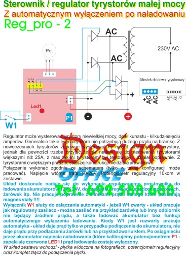 Jest to sterownik dwóch tyrystorów małej mocy. Układ różni się od swojego poprzednika (RegPro1) tym, że posiada funkcję automatycznego wyłączenia po naładowaniu. Potencjometrem na płytce należy wykalibrować napięcie po przekroczeniu którego układ wyłączy ładowanie. Układ działa "jednorazowo" - tzn. po przekroczeniu napięcia progowego, czyli naładowaniu akumulatora przechodzi w stan wyłączenia. Nie włączy się ponownie w przypadku spadku napięcia na akumulatorze. Nie może w związku z tym działać jako prostownik buforowy. Ponowne rozpoczęcie procesu ładowania będzie możliwe po odłączeniu i ponownym podłączeniu akumulatora, lub po wyłączeni i włączeniu urządzenia do sieci. Jeśli zastosujemy nowoczesne tyrystory z małym prądem bramki, układ powinien wysterować nawet tyrystory 50A, w przypadku tyrystorów starego typu z dużym prądem bramki - układ raczej nie wysteruje tyrystorów o prądzie większym niż 25A, aczkolwiek można spróbować. Układ umożliwia płynna regulację prądu ładowania akumulatora. Do zbudowania prostownika potrzebny jest transformator o napięciu około 15-18V oraz mostek diodowo-tyrystorowy - 2 diody mocy i 2 tyrystory.