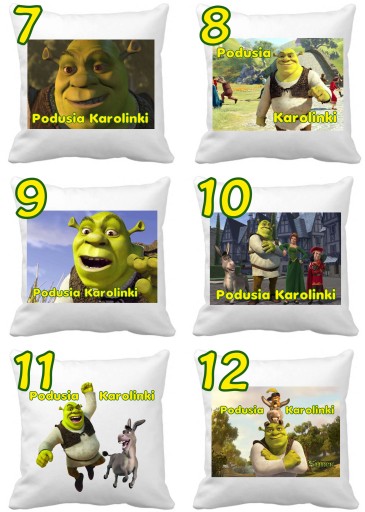 Sympatyczna Foto Poduszka SHREKA z gotowymi wzorami do wybrania z własnym imieniem.