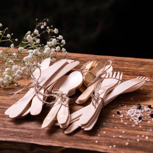 Sztućce drewniane wykonane są z naturalnie jasnego drzewa brzozy. W przeciwieństwie do innych gatunków nie wymaga bielenia. Są w 100% biodegradowalne.