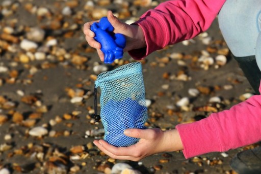 W zestawie cztery miękkie foremki w kształcie kraba, delfina, muszelki i dziecięcej stópki, całość zapakowana w siateczkę ściąganą sznurkiem.