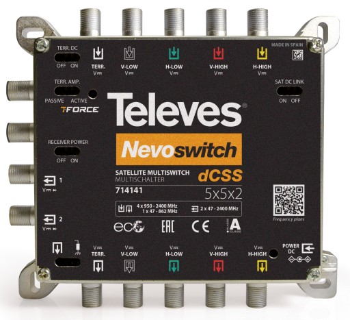 Urządzenie obsługuje standardy SCR I (EN50494) i SCR II (EN 50607). Instalacja w topologii gwiazdy lub kaskady (ustawienie za pomocą przełącznika). Unikatową cechą NevoSwitch dCSS jest możliwość zasilania urządzenia z dowolnej części systemu: można wyizolować multiswitch z kaskady przełączając położenie DC LINK, dzięki czemu instalator może wybrać najlepsze rozwiązanie dla każdego scenariusza. Zasilanie może być dostarczone z dedykowanego zasilacza Televes ref. 732101 (dostępne w naszym sklepie).