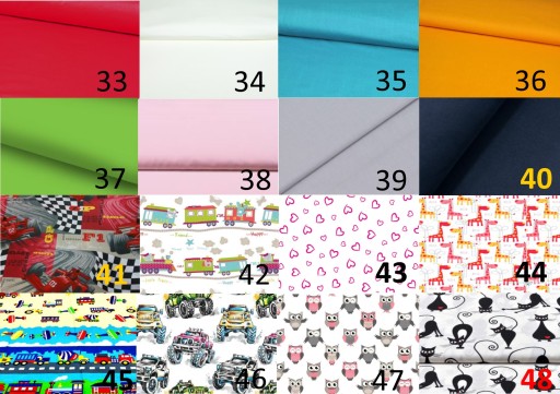 31.Żółto-szary zygzak 32.Żółto-szara kropka 33.Czerwony 34.Biały 35.Niebieski 36.Pomarańczowy 37.Zielony 38. Różowy 39. Szary 40.granat